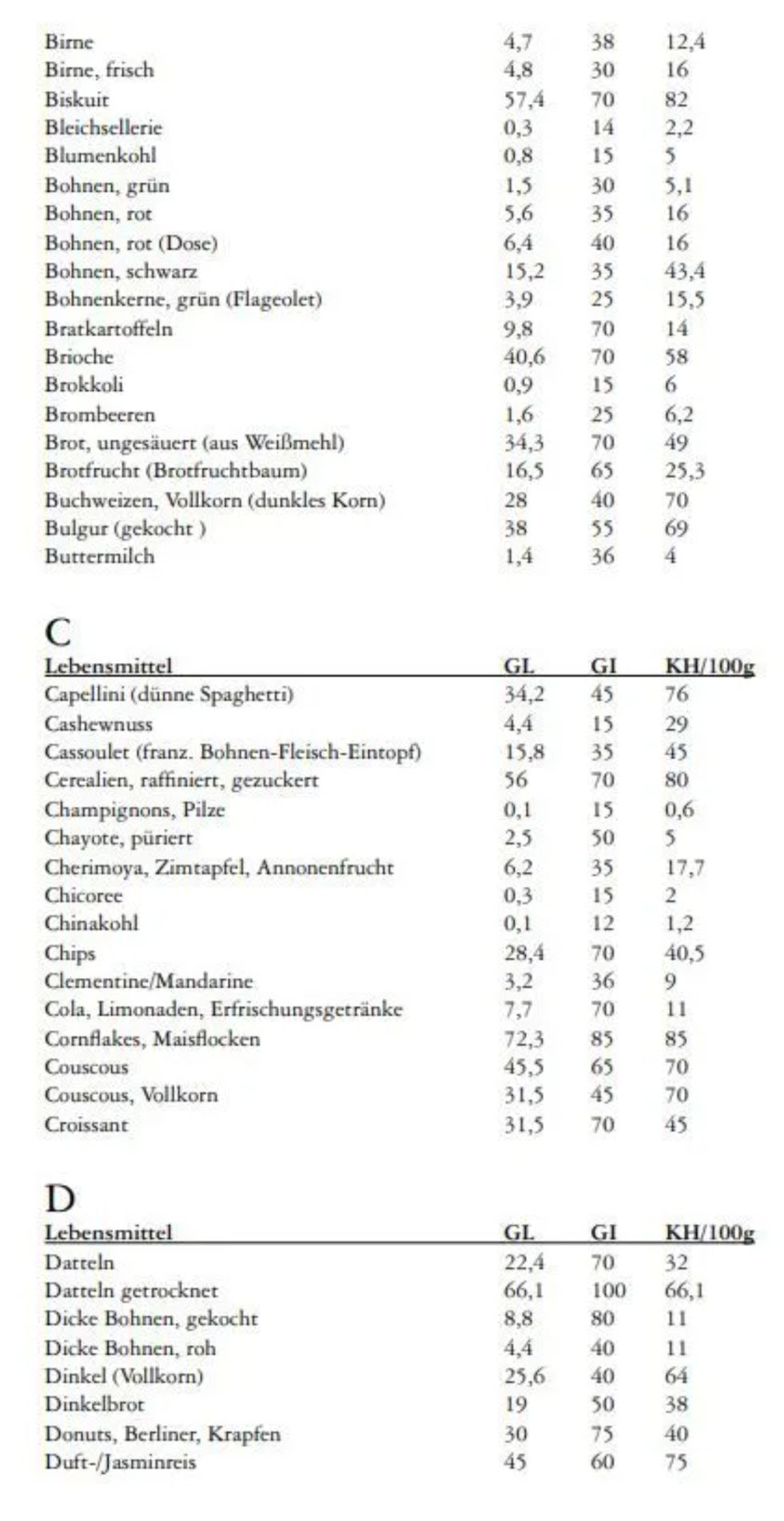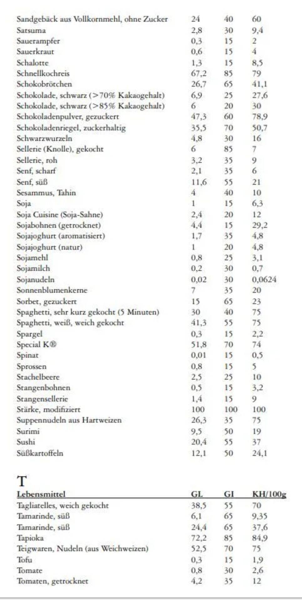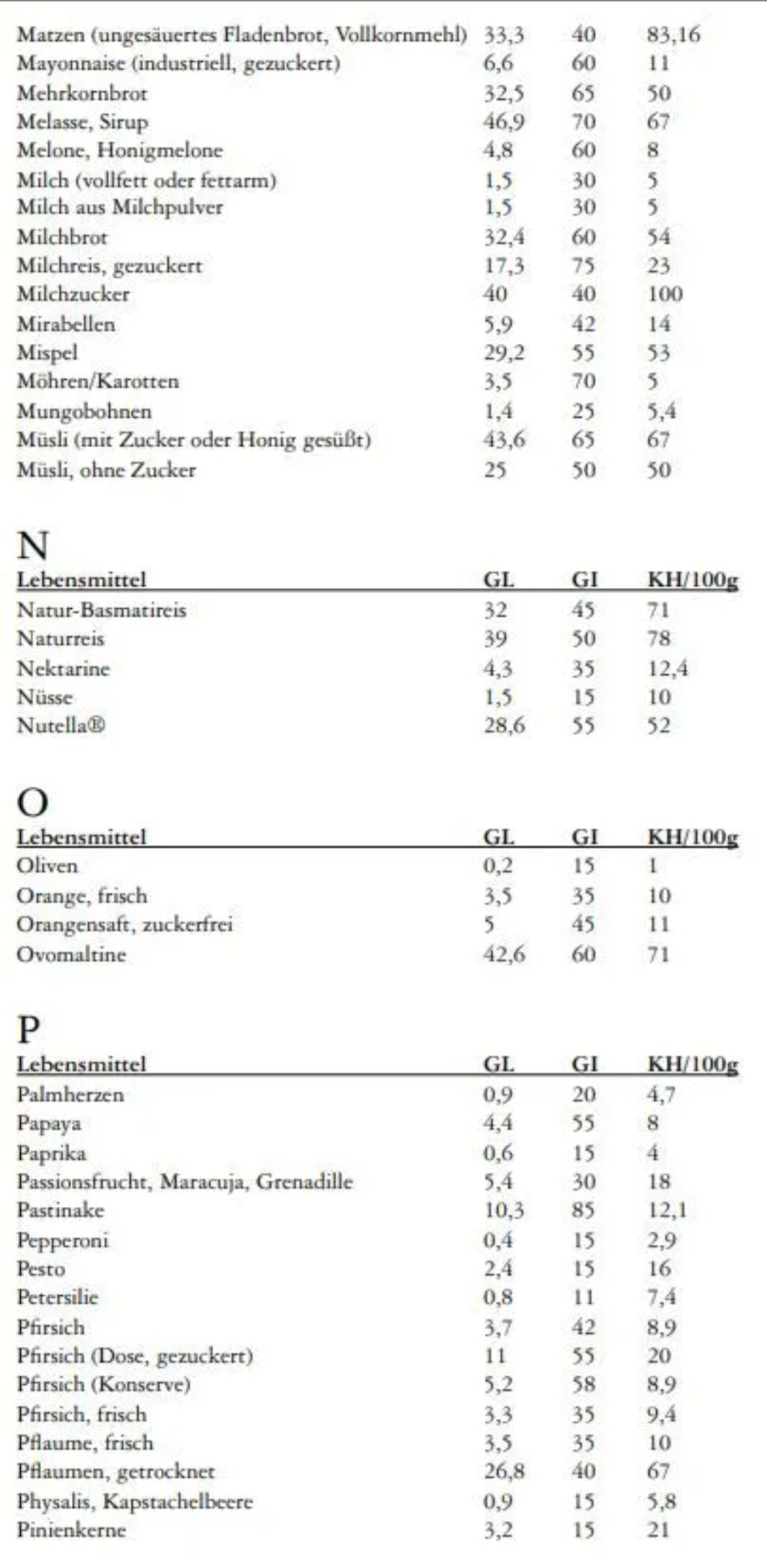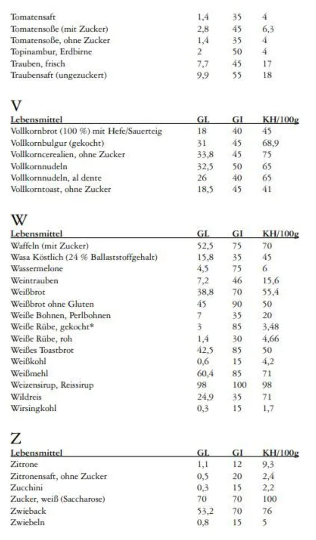 Nachfolgend zwei Tabellen für glykämischen Index und für glykämische Last