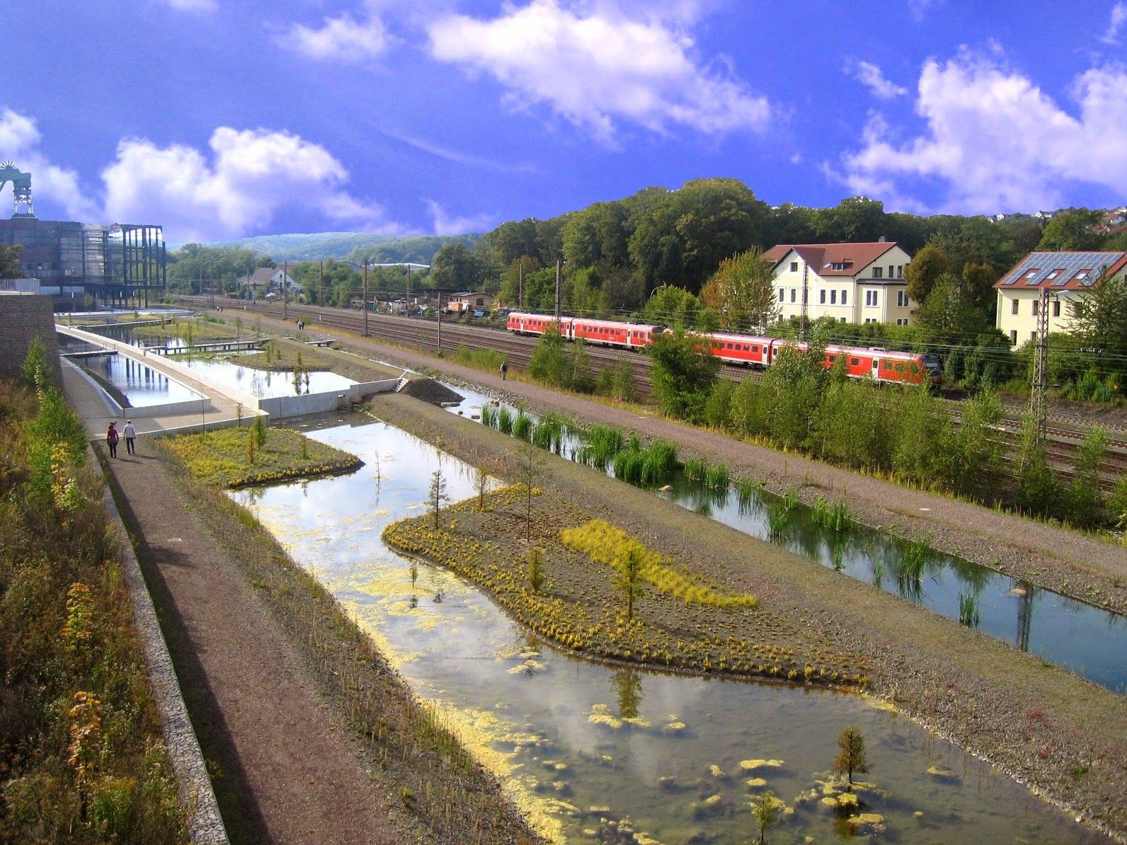 Der Wassergarten in Landsweiler-Reeden ist ein gestalterisches Highlight des Garten Reden als Standort für Freizeit und Tourismus. Technisch gesehen dient das in fünf Becken unterteilte System zur Pufferung sämtlicher Regenwässer am Standort, zur energetischen Nutzung und Abkühlung des Grubenwassers und damit auch zur ökologischen Entlastung des Klinkenbaches.