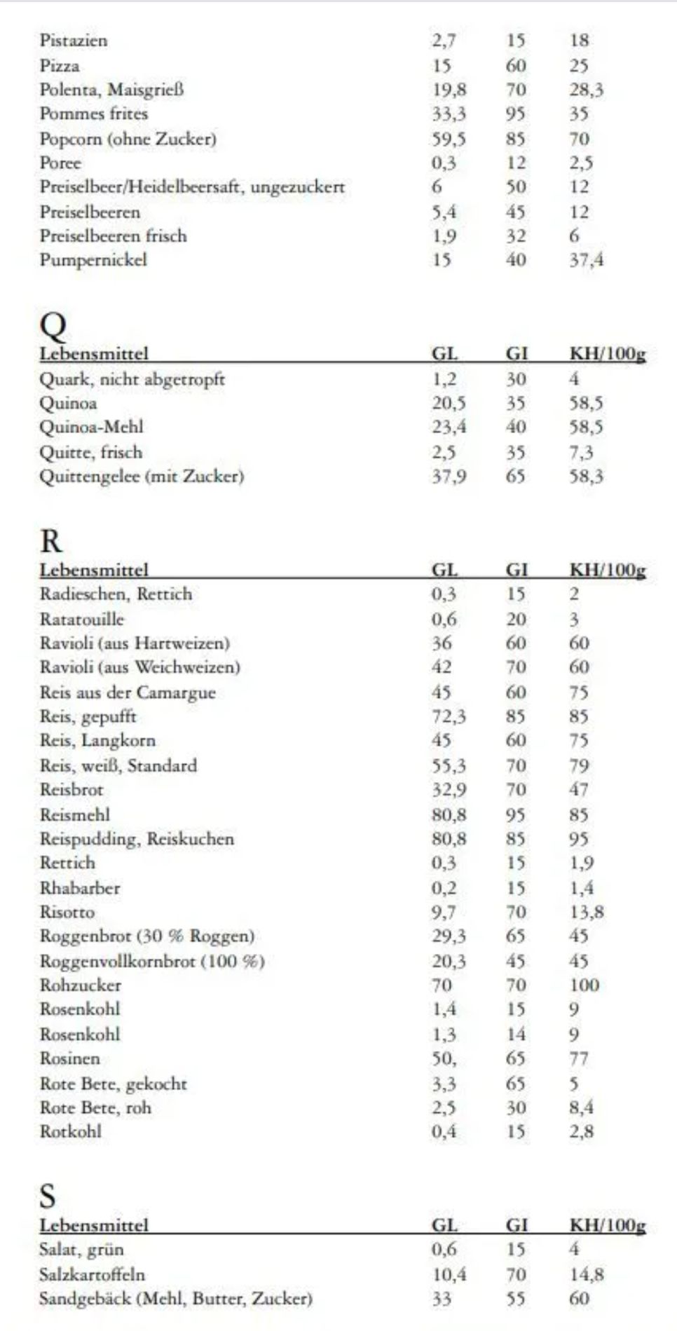 Nachfolgend zwei Tabellen für glykämischen Index und für glykämische Last